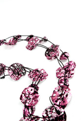 A striking, eco-conscious statement necklace crafted from upcycled plastic bottles and soft leatherette. Each sculptural, lotus-root-inspired piece is individually shaped and splattered in vivid shades of pink, creating a dynamic, textured effect. Lightweight and flexible, it drapes beautifully and adds an artistic touch to both everyday and evening outfits.
