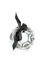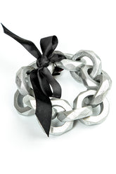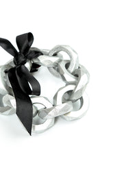 This sculptural bracelet features chunky geometric wooden links coated in a soft silver finish, creating a modern statement look. The black ribbon closure adds a refined contrast and allows the fit to be easily adjusted. Lightweight yet bold, it brings an artistic, contemporary edge to any outfit.