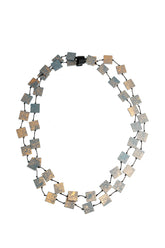 Confectionné en bois recyclé, ce collier célèbre la texture naturelle avec une touche géométrique moderne. Chaque pièce carrée est délicatement brossée pour un effet de poussière d'or, créant un doux scintillement au moindre mouvement. Sa silhouette allongée se drape avec élégance sur robes, tuniques et tricots, apportant une touche de modernité et de naturel à toutes les tenues.