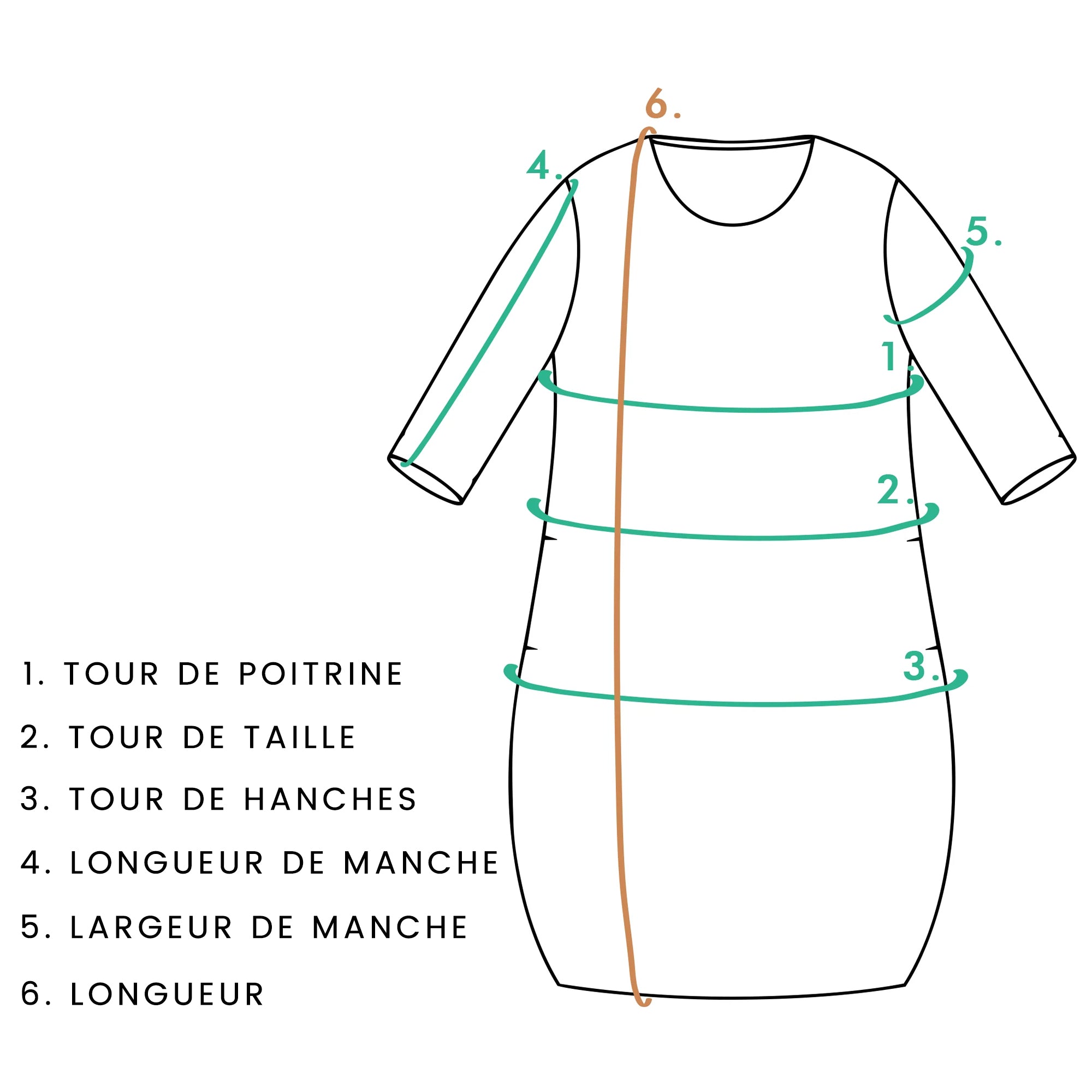 | Taille | Buste (CM) | Taille (CM) | Hanches (CM) | Longueur de manche (CM) | Largeur de manche (CM) | Longueur (CM) |