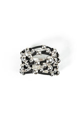 Dieses markante silberne Orbits-Armband aus Gummi besticht durch ineinander verschlungene Gummischlaufen und eine elegante silberfarbene Schnalle, die einen modernen, skulpturalen Look kreieren. Leicht und dennoch auffällig verleiht es jedem Outfit – vom lässigen Tageslook bis zum eleganten Abendkleid – eine künstlerische Note.
